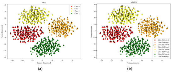 In this section, t-distributed stochastic neighbor embedding (t-SNE) is employed to visualize high-dimensional features in a low-dimensional space, thereby providing deeper insight into the strengths and limitations of each method. The HUSTbearing dataset is selected as a representative case for feature visualization. The detailed t-SNE visualization results for all compared methods under the scenario at 65 Hz are illustrated in Figure 15.
