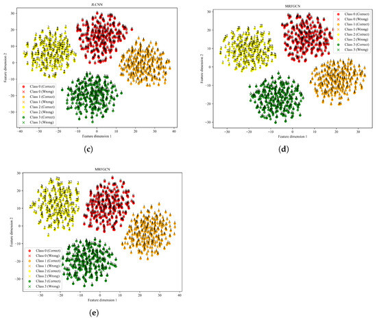 Feature visualization of different methods. (a) Ours. (b) MTCNN. (c) JLCNN. (d) MRFGCN. (e) IDBN.