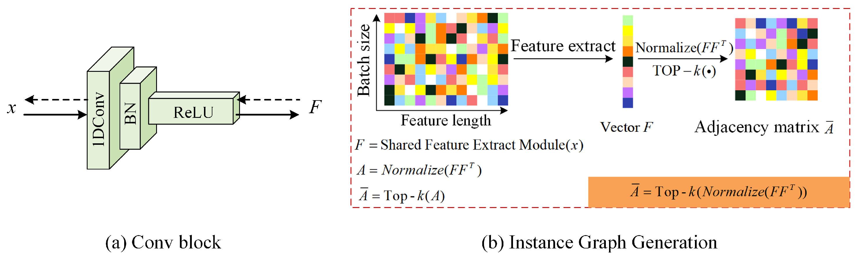 . To analyze the structural relationships within the input features, the extracted features are transformed into instance graphs. Initially, a convolutional layer (Conv) is applied to extract meaningful features from the raw vibration data. The detailed structure of the Conv block is illustrated in