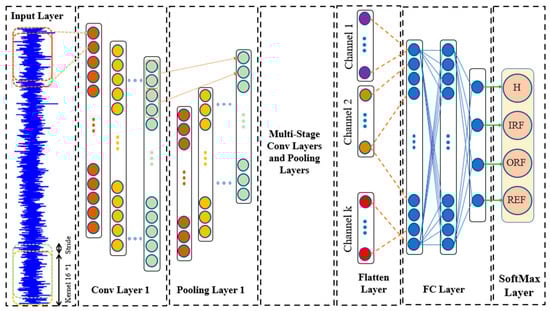 In this study, two one-dimensional CNN models are used for fault detection of REBs, which include the SCNN model and the TL-CNN model with fine-tuning. These models are designed to process one-dimensional signal data and extract important features for classifying different types of faults. The SCNN model, as one of the effective tools in DL, is applied to analyze one-dimensional signals from REBs. The architecture of the SCNN model is shown in Figure 1.