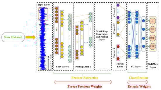 The TL-CNN model is designed to improve the model’s ability to recognize and analyze new data with different distributions. This model is trained in two distinct phases. In the first phase, the model is pre-trained using laboratory data collected under varying operating conditions, including seeded faults. These data are obtained in controlled environments and encompass a wide range of operational conditions for the REB. In the second phase, the pre-trained model is adapted to new data. During this phase, the convolutional layers, which are responsible for feature extraction, remain fixed, while only the fully connected (dense) layers are fine-tuned using the new dataset. This two-phase approach ensures that the model leverages prior knowledge while adapting to new conditions. The architecture of the TL-CNN model is illustrated in Figure 2.