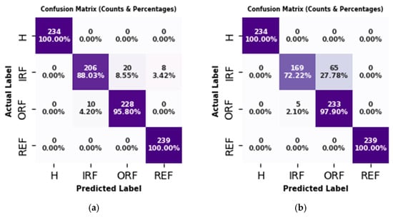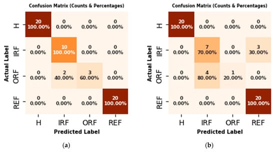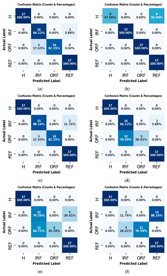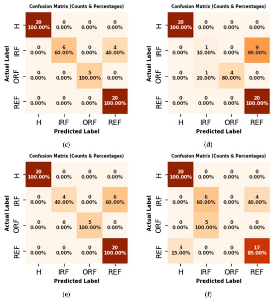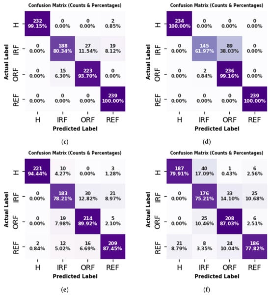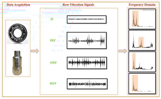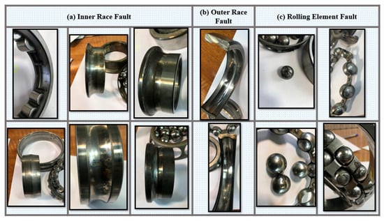 For the purposes of this study, artificial faults were introduced into the REBs, and laboratory tests were conducted under four different fault conditions, including H, IRF, ORF, and REF, across 36 different operating conditions (Figure 12). It is worth mentioning that, from a practical point of view, the type of fault (fault existence on the either of elements) has little importance. On the other hand, ensuring degradation on any of the IR, OR, or RE leads to a same recommendation, that is, “Replacing the REB”. However, identifying the fault type enables experts and machine owners to make more informed and confident repair decisions