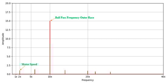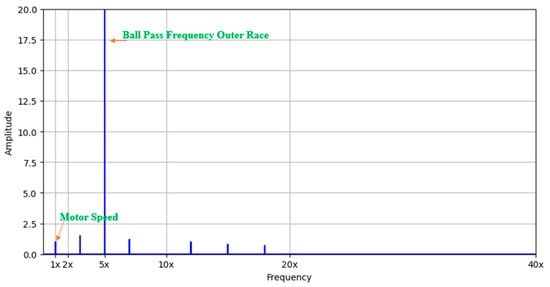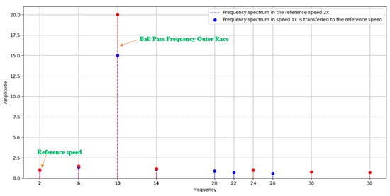 For example, in Figure 5, Figure 6 and Figure 7, the process of synchronizing the frequency spectrum of vibration signals to a reference framework is illustrated. Figure 5 presents the frequency spectrum of a signal collected at a rotational speed of 1x, where the frequency components and corresponding amplitudes are clearly observable. Figure 6 depicts the frequency spectrum of a signal at 2x speed, showing significant changes in the position and intensity of frequency components due to the increase in rotational speed. Figure 7 demonstrates the transformation of the frequency spectrum from 1x to a reference speed of 2x. This transformation is achieved through frequency normalization relative to rotational speed and linear interpolation of amplitudes, ensuring the alignment of data within a common reference framework. For instance, the 5x rotational speed frequency in this case corresponds to the outer race fault of the bearing. This approach enhances the accuracy of vibration data comparison and eliminates the adverse effects of rotational speed variations on DL-based fault analysis. Consequently, standardizing vibration data not only improves the generalization capability of signal processing models but also enhances the accuracy of fault detection.