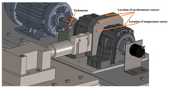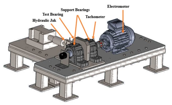 To evaluate the proposed model, an REB test setup was required. In this regard, a setup with the capability to vary load and speed during the REB degradation process was developed in the Condition Monitoring Laboratory of Sharif University of Technology. A CAD model of the setup is shown in Figure 8. For emergency load control, a hydraulic power pack load control system is used, which is managed through a computer. In this design, the target REB is placed between two REBs that act as supports. Another feature of this setup is the controllability of the rotational speed through its motor drive. The speed value and the vertical and horizontal vibrations of the load applied to the REB can be measured in real-time by this setup. In this study, data from a horizontal accelerometer sensor, which is aligned with the applied load, are utilized.