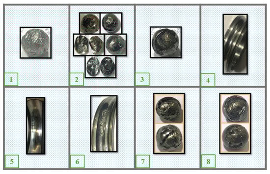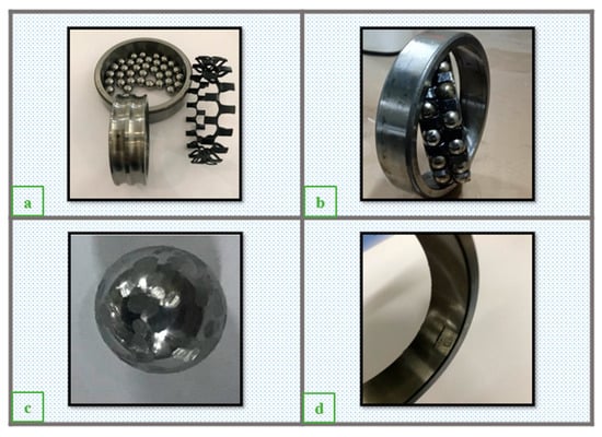 In this platform, shown in Figure 20, a vibration sensor and a temperature sensor were mounted on the test REB. The REB used in these experiments is deep groove with the code 6907. The accelerated life tests were conducted under constant operating conditions with a speed of 2000 rpm and a radial load of 9000 N. The sampling frequency of the accelerometer sensor was 25.6 kHz. Figure 21 shows the observed damage in the components of each REB after disassembly at the end of each test.