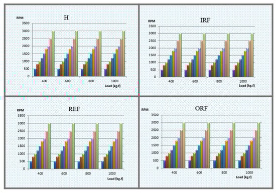 To present the results, two commonly used industrial features in fault diagnosis are employed. The first feature is the root mean square (RMS) of acceleration, which is calculated for all operating conditions and the four faults, including H, IRF, ORF, and REF. The results are shown in Figure 13, where, for each fixed radial load, the rotational speed ranges from 500 rpm to 3000 rpm. As seen in the graphs, the vibration amplitude under the ORF condition is the highest compared to the other fault conditions. The vibration amplitudes in the IRF and REF conditions are the second highest, following the ORF.