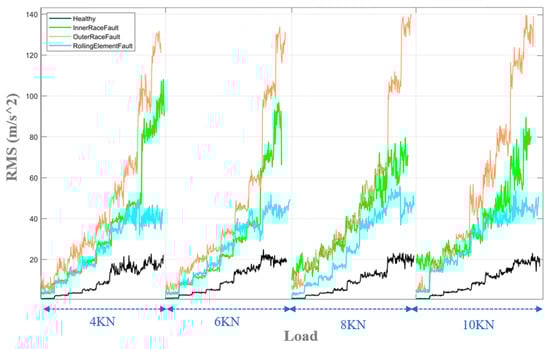 RMS feature representation for four REB conditions as rotational speed varies from 500 rpm to 3000 rpm at fixed radial loads.