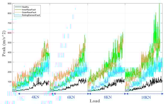 The second feature is the peak, which is calculated for all operating conditions and the four fault scenarios. Similar results are shown in Figure 14.