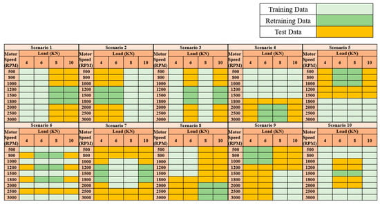 In each of the ten scenarios, the dataset was systematically divided into training and testing subsets based on varying operational conditions. As illustrated in Figure 15, the distribution of training and testing data is defined for each scenario, with varying proportions across different cases. Additionally, to ensure robust model evaluation, 10% of the training data in each scenario was allocated for validation.