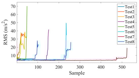 The trend of RMS for eight accelerated life tests.