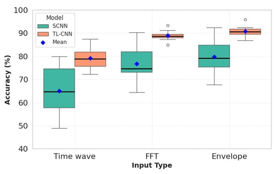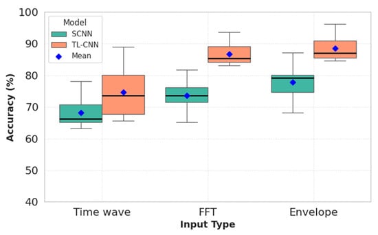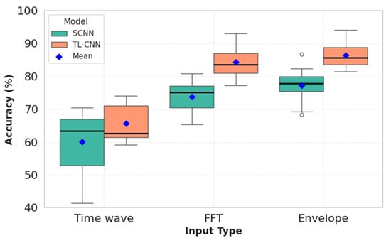 The presented box plot diagrams provide a detailed representation of the distribution of accuracies for each input type. Notably, the signal envelope input demonstrated the best performance in both models, with the proposed TL-CNN method achieving the highest accuracy in fault detection. In contrast, the time-domain signal input exhibited the poorest performance, likely due to its limited ability to extract discriminative features required for accurate fault classification. Additionally, the mean accuracy values for each input type are clearly depicted in the diagrams, effectively illustrating the overall performance trends of the models.