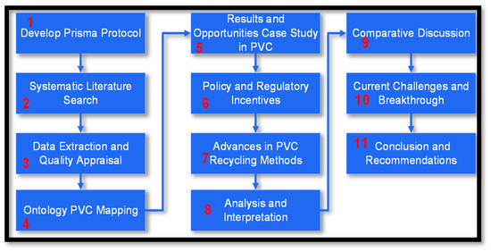 Applied systematic methodology used in this review, consisting of 11 sequential steps: (1) Develop PRISMA protocol, (2) Systematic literature search, (3) Data extraction and quality appraisal, (4) Ontology PVC mapping, (5) Results and case studies, (6) Policy and regulatory incentives, (7) Advances in PVC recycling methods, (8) Analysis and interpretation, (9) Comparative discussion, (10) Current challenges and breakthroughs, and (11) Conclusion and recommendations (Authors’ own elaboration).