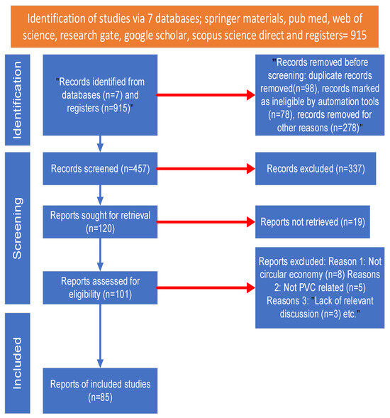 The selection criteria aimed to ensure a comprehensive review by analysing a diverse range of peer-reviewed sources, case studies, and global practices related to PVC waste management and recycling. Databases such as PubMed Central, Google Scholar, ResearchGate, ScienceDirect, Web of Science, Springer Materials, and Scopus were utilized to provide a reliable foundation for the literature review.