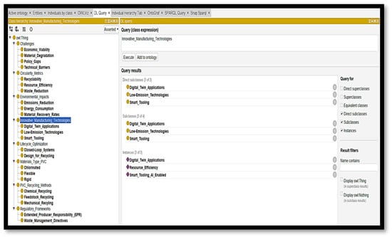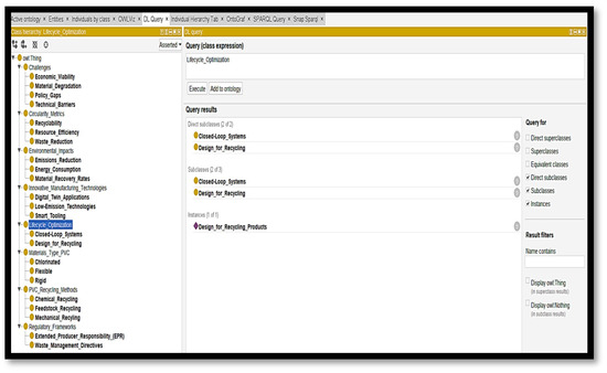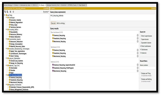 Ontological mapping, using Protégé, structured our knowledge about PVC recycling processes. This approach visualized interdependencies among recycling technologies, environmental policy, and system optimisation within a circular economy framework. Combined with LCM’s operational models [14], the ontology’s semantic networks are enhanced by incorporating energy flow constraints, machine-level carbon emissions, and supply chain decentralisation strategies, thus offering a simulation-ready platform for lifecycle-based decision-making [25].