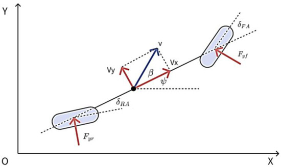 In which is the vehicle mass, is the equivalent yaw moment of inertia, and are the lateral tire force of front and rear wheel, respectively, and are the steer angle of front wheel and rear wheel, and and are the distance from the vehicle center of gravity to front and rear axles.