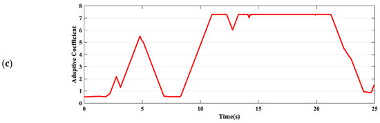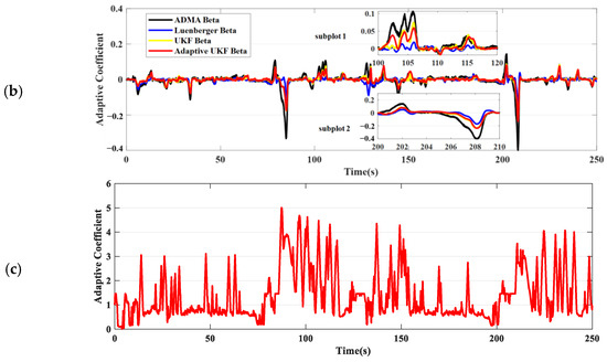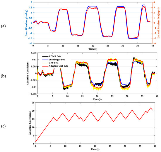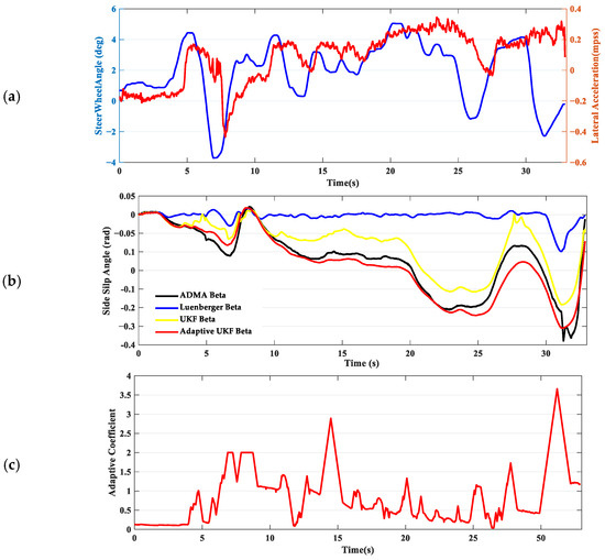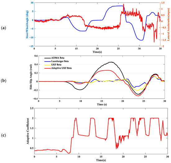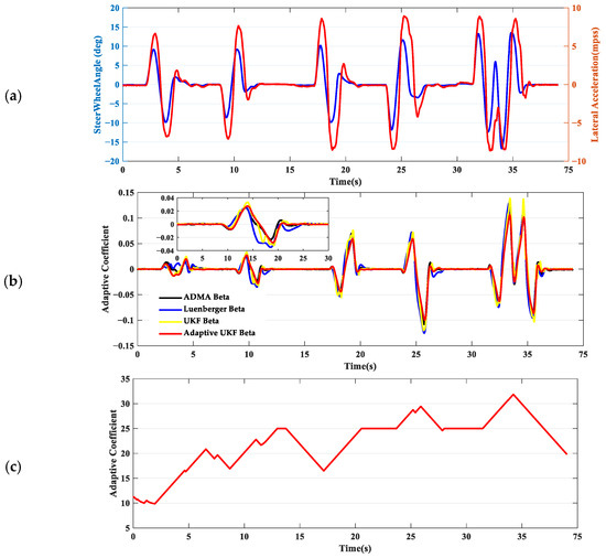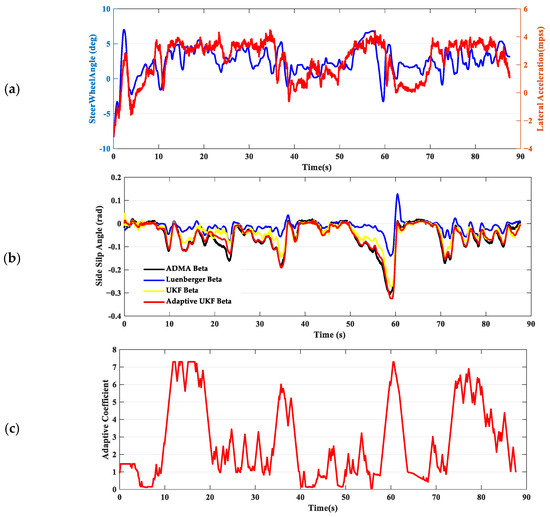 In scenario 5, the driver performs a relatively smooth slalom maneuver on an asphalt surface, maintaining a speed around 80 kph, with lateral acceleration approximately between 0.2 and 0.3 g. From the comparison of the maximum estimation error and the deviation in RMSE presented in Table 2, there is not a significant difference among the three estimates. The biggest difference is that the UKF estimation results without an adaptive strategy are relatively rough. This is mainly because a fixed smaller R is used to ensure system convergence, leading to a significantly increased feedback gain based on model errors. As a result, this can cause overshoot in the estimation, which in turn makes the estimation of the sideslip angle exhibit spikes. In comparison with the adaptive coefficient under low adhesion conditions, the adaptive coefficient of the system on asphalt surfaces is significantly larger, as shown in Figure 10c. The results not only ensure estimation accuracy, but also provide smoother estimates, which effectively verifies the correctness of increasing the adaptive coefficient as the friction coefficient increases.