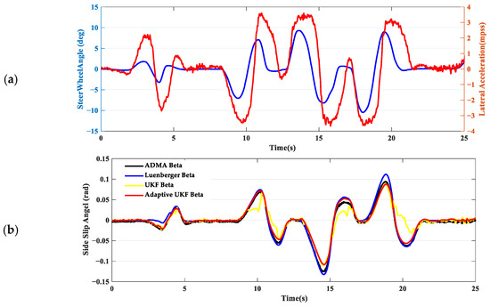 In scenario 1, the driver controls the steer wheel, acceleration pedal, and brake pedal to make the vehicle maintain a steady circular motion on the ice ring, and the reference speed is about 40 kph. The steer angle is given in Figure 6a, along with the lateral acceleration. In this scenario, the vehicle maintains a large slip angle for an extended period, and the tires are constantly in a nonlinear region. From the real vehicle test data, the estimation strategy based on the Luenberger observer performs poorly under these operating conditions, showing significant estimation errors, and the max error reaches 0.291 rad. Otherwise, the estimated values still demonstrate good convergence characteristics. The UKF increases the adaptive coefficients (the R matrix) when the tires experience sustained large slip. This adjustment reduces the reliance on the dynamic model. The data results confirm that this adaptive logic can effectively improve the estimation accuracy of the slip angle. As shown in Figure 6b, the estimation error is appropriately reduced after adopting the adaptive strategy, and the Root Mean Square Error (RMSE) decreases from 0.0436 rad to 0.0386 rad, as shown in Table 2.