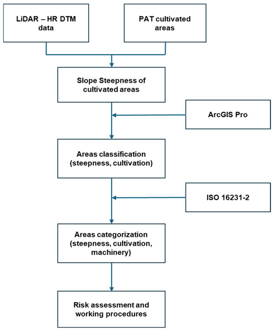 The study aimed at combining data from the LiDAR system owned by the Autonomous Province of Trento (PAT) [49] and those related to tilt angles for self-propelled machinery provided by the EN ISO 16231-2 standard [48] in order to classify and categorize cultivated areas based on roll-over risk. Moreover, details of the scheme followed are illustrated in Figure 1.