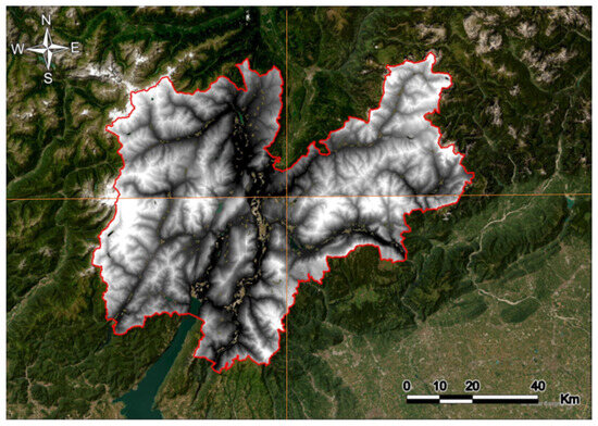 Autonomous Province of Trento digital elevation map to identify mountainous and hilly areas (dark grey) and flat ground (white/light grey).