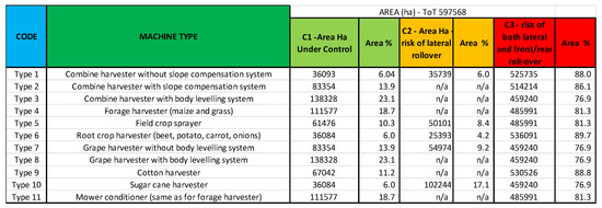 These data were merged with the different types of self-propelled machines reported in the EN ISO 16231-2: in Figure 5, a synthesis of this elaboration is reported considering the total surfaces expressed in hectares (e.g., for Type 1 machinery (Combine harvester without slope compensation system), the majority of the territory (525.735 hectares) belong to category C3, i.e., the most dangerous one).