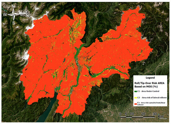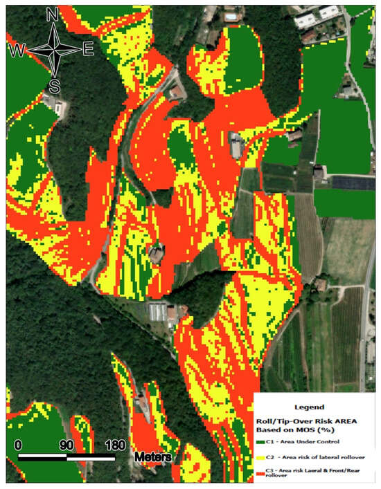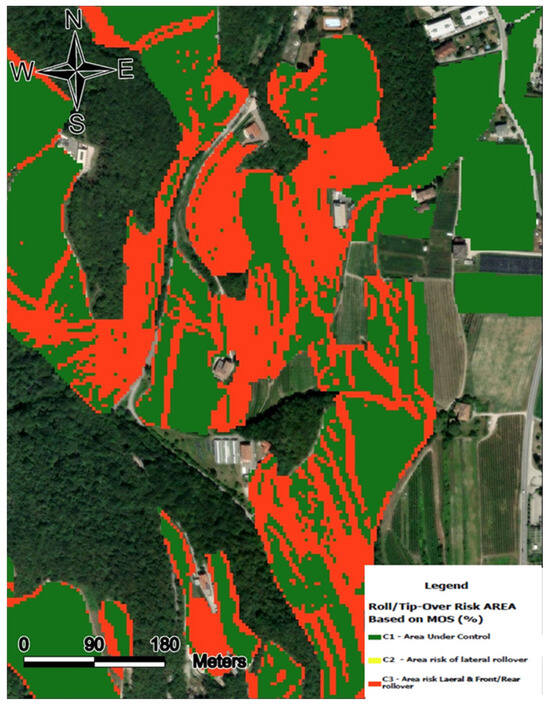 Thus, the final step of the categorization consisted in adding information on the type of cultivation by developing risk maps that consider three variables for each type of machinery: MOS, slope steepness, and cultivation type. In other words, using ArcGIS software, the information related to cultivation type and steepness is merged to create specific roll/tip-over risk maps.