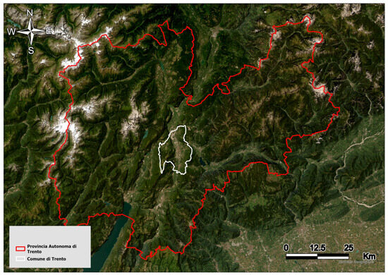 To delve deeper into this aspect of the study, a specific analysis was carried out that took into consideration the grape harvester and slope of vineyards, focusing on a restricted area delimited by the Municipality of Trento: in Figure 8, the positioning of this area (identified by the white boundary) into the PAT region (identified by the red boundary) is shown.