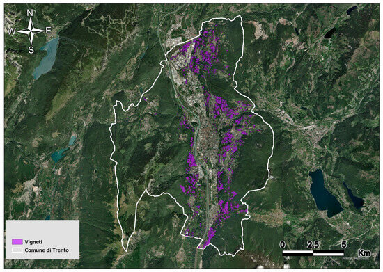 In this area, grape cultivation is very diffused, covering 1262.4916 hectares, i.e., almost 50% of the whole cultivated area of the municipality of Trento. In Figure 9, the map of the vineyards’ location is represented: purple-coloured areas represent the vineyards, while the white border indicates the limits of the municipality.