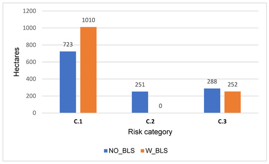 For this case study, the following machinery was chosen: (1) a grape harvester without a body levelling system (NO_BLS); and (2) a grape harvester with a body levelling system (W_BLS). The above-mentioned machines are most likely used in areas intended for grape farming. The total area dedicated to the cultivation of grapes was then analyzed to verify the slope of each field: these data were merged with the information related to MOS and RAAS of the machinery to determine the roll/tip-over risk. In Figure 10, data related to the risk level areas are reported for both kinds of machinery (NO_BLS and W_BLS).