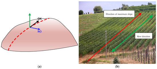 Slope lines for safe work activities in C.2 areas: (a) correct (OK) and incorrect (NO) working paths; (b) safe directions for planting new cultivations.