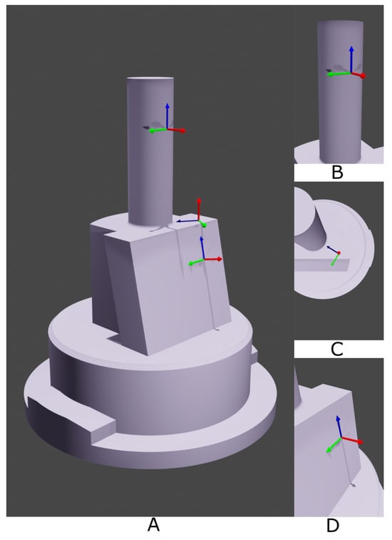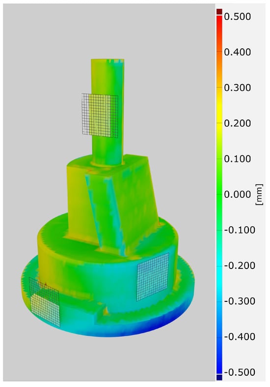 The nominal CAD model and the files used for the printing and the inspection were prepared using the CATIA V5-6R2018 (Dassault Systèmes, Vélizy-Villacoublay, France) CAD software. The tessellated file used to prepare the printing process was created with a maximum permissible chord error of 0.001 mm between the nominal geometry and the lines of any triangle created by the tessellation process and a maximum edge length of 0.1 mm to obtain a regularly meshed tessellated file. Consequently, the file contained 340,925 points and 681,846 triangles and should be a negligible source of geometric deviations for the experiments. We focused exclusively on non-horizontal surfaces for training and evaluating the compensation CNN. This decision is driven by 3D printing’s layer-wise nature, where even minor compensations on horizontal surfaces will necessarily cause a discrete layer change.