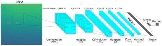 In this section, we present the development of a compensation CNN designed to interpret the deviation scalar represented in the 2D grid arrays prepared in the previous section. These grid arrays serve as input data, akin to grayscale images with dimensions of 20 × 20 pixels. Given the small size of the inputs, we adopted an architecture inspired by the Visual Geometry Group (VGGNet) [], renowned for its use of small convolution filters (3 × 3) but with significantly increased depth. During our implementation, we found that a combination of 5 × 5 and 3 × 3 convolution filters yielded better performance after hyperparameter tuning. The final architecture of the compensation CNN, illustrated in Figure 4, incorporates Rectifier Linear Units (ReLUs) alongside each convolution filter to introduce non-linearity. Additionally, max-pooling layers were integrated to capture the most salient features while reducing computational complexity in subsequent layers. The number of channels , , , and were also optimized, and the best-performing numbers of channels were 9, 17, 27, and 64, respectively.