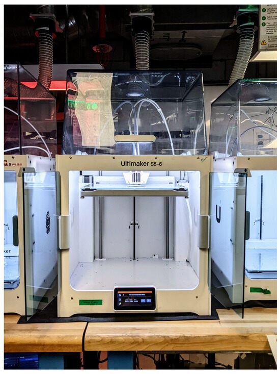 To assemble the dataset, a combination of four Ultimaker 3 and four Ultimaker S5 (Ultimaker, Geldermalsen, The Netherlands) 3D printers, shown in Figure 6, were employed using 2.85 mm polylactic acid (PLA) filament from Polymaker (Polymaker, Shanghai, China). The training dataset comprised 12 sets of five 3D printed parts of the chosen reference geometry, totaling 60 3D printed parts. It is important to note that each Ultimaker 3 produced two sets of parts. However, the first sets were printed much earlier than the second sets and should be considered independent due to potential differences in printer calibration or environmental conditions. Each part was printed using the default “fast” printing parameters from the Cura 4.13.0 (Ultimaker, Geldermalsen, The Netherlands) slicing software. The key printing parameters are presented in Table 1 and are the same for both 3D printer models.