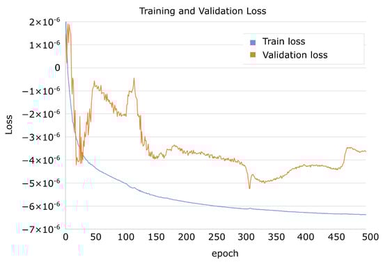 We now present the results of the training process for the compensation CNN. This training process spanned 500 epochs and lasted 3 h. Figure 8 illustrates the progression of these losses throughout the training period. The presented loss metrics provided insights into the performance of the CNN, indicating its ability to approximate the average deviation scalar field. Optimal performance was observed when the validation loss reached its minimum, highlighting the model’s effectiveness. Notably, at epoch 306, the CNN achieved its lowest validation loss, suggesting more robust generalization capabilities. The MSE validation loss was mm2 and the MSE training loss was mm2. The MSE loss presented here is the difference between the MSE loss of deviation at the current vertex and the MSE loss of the compensation CNN’s output. It is negative because the CNN output is closer to the ground truth than the input deviation. However, after this epoch, an increase in the validation loss was noted, indicative of potential overfitting.