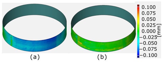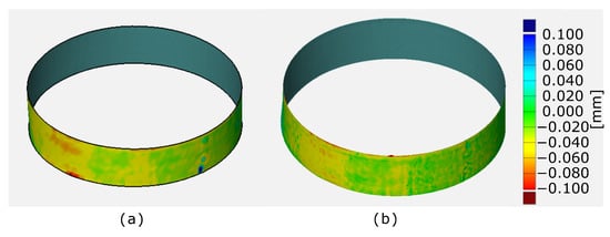 The average deviation of n parts is computed by Equation (3) with , the error of scanned part i. The systematic deviation average remains constant, and the averaged random deviation components are added. Equation (4) shows the deviation of a part compensated with the average deviation scalar field. The systematic deviations are still eliminated. However, the random error component is reduced by a factor , improving the geometric accuracy of the compensated part.