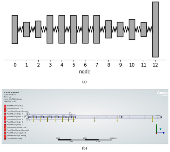 In this study, two models are considered. The first includes only torsional degrees of freedom and has a total of 13 nodes. This model is originally built in openTorsion [16], but is later verified with a torsional vibration model prepared in Ansys Mechanical 2024R2. In the second bending model, the complexity was increased by introducing additional nodes in order to introduce bearing positions and perform bending analysis. The second model has 28 nodes. Both models are shown in Figure 1. Data for the first torsional model can be found in the literature [15]. Shaft element and lumped mass parameters for the second bending model are shown in Table 2 and Table 3. In Figure 1b, the arrows pointing down indicate the positions of the radial bearings. Additionally, the arrow shown approximately in the middle of the intermediate shaft indicates the standard gravity applied to all shaft and lumped mass elements.