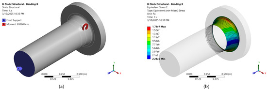 Considering the worst-case scenario of shaft alignment from Section 2.2, a static bending moment of 69.56 kNm is identified as acting on the intermediate shaft. Due to shaft rotation, this induces dynamic bending cycles. The maximum equivalent stress of 17.1 MPa is observed at the flange fillet, as shown in Figure 5b. Taking into account the obtained value of the stress due to static bending, the allowable intermediate shaft stress due to torsional and bending vibrations is obtained in the form: