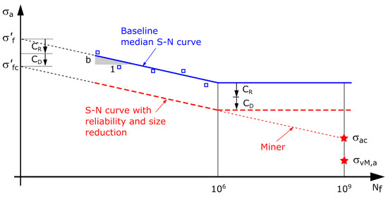 which refers to mirror-polished and notch-free conditions, here it is estimated that it is enough to take the reliability factor and the size factor [31,32], as can be seen in Figure 7.