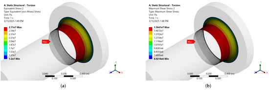 Static structural response of intermediate shaft flange fillet due to torsion—denser FE mesh. (a) Equivalent stress. (b) Max. shear stress.