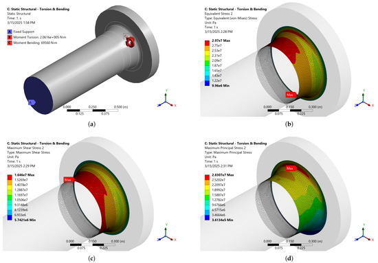 Static structural response of intermediate shaft flange fillet due to torsion and bending—denser FE mesh. (a) Load and boundary condition. (b) Equivalent stress. (c) Max. shear stress. (d) Max. principal stress.