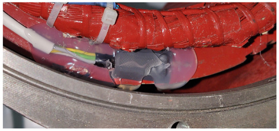 This SM was modified by adding 14 temperature sensors (Pt-100) to monitor the temperature in the stator windings, in the iron core and in the cooling air. An example of Pt-100 installation in the stator windings can be observed in Figure 1 and in the stator iron core in Figure 2. The synchronous machine after the installation of all the temperature sensors is shown in Figure 3.