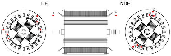 The position of all the temperature sensors installed in the machine are displayed in Figure 4. The sensors are installed in the windings (1, 2, 3, 4, 9, 10, 11, and 12) to try and observe the temperature variations in opposite sides of the stator, and in the iron core (5, 7, 13, and 15) of the driven end (DE) and the non-driven end (NDE). The sensors are placed at the right and left side of the machine. Moreover, there are two external sensors for cold air (14) and hot air (6).