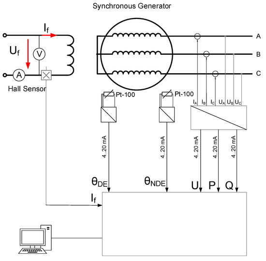 The electrical metering devices are placed in (6). The values of the active power (P), reactive power (Q), and stator voltage (U), are measured by a commercial 3-channel programmable transducer (SINEAX M563, ABB Measurement & Analytics, Wohlen, Switzerland) fed from three current transformers. The field current (If) is measured using a Hall effect sensor directly compatible with an Arduino© microcontroller. All the electrical measurements are recorded on a computer through an Arduino© microcontroller, communicating via the COM port of the computer. All the temperature metering devices are placed in (7). The temperature sensors are connected to the microcontroller through Pt-100 to 4… 20 mA converters. A simplified electrical diagram is shown in Figure 6.