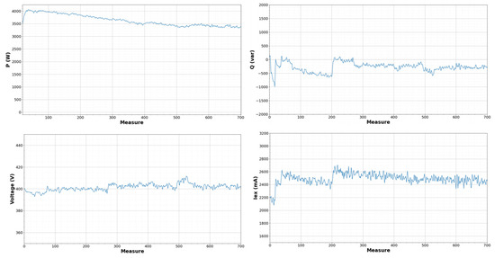 Multiple tests have been carried out to characterize the thermal behavior of the SM to have a great dataset to train a neural network that predicts the temperatures of the sensors during the operation of the machine. In all the tests, electrical and thermal variables are measured. Figure 8 and Figure 9 show these variables during a heating test: