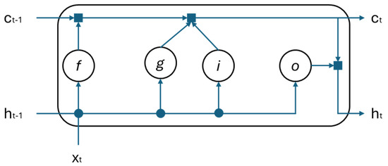 In the figure, xt is the input, ht is the hidden state, ct is the cell state, f is the forget gate, g is the memory cell, i is the input gate, and o is the output gate.