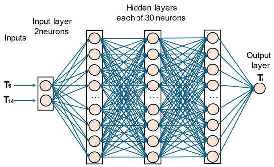 The LSTM for the cooling scenarios has only T6 and T14 as inputs. Its architecture is slightly different from that of the heating scenarios due to the number of inputs and the number of neurons. Each hidden layer now has an optimal number of 30 neurons. The architecture is shown in Figure 15.