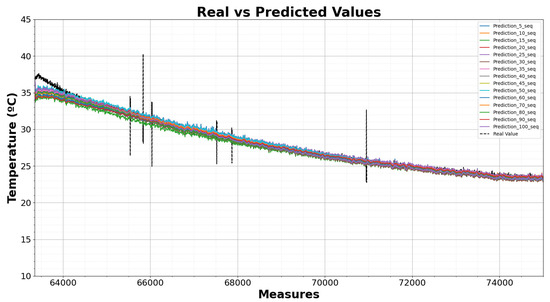 To present the results more clearly, only the results obtained using the LSTM trained to predict the results for temperature sensor 2 are shown, but all sensors have an individual LSTM to predict their values. The results obtained in the testing phase (with the different LSTMs trained), using the data from the heating test with P = 3500 W and Q = 0 var to predict the temperature of the sensor 2, are shown in Figure 17. In black is shown the real temperature values measured during the test, and the other colors show the predictions made by the LSTMs trained with different numbers of sequences.