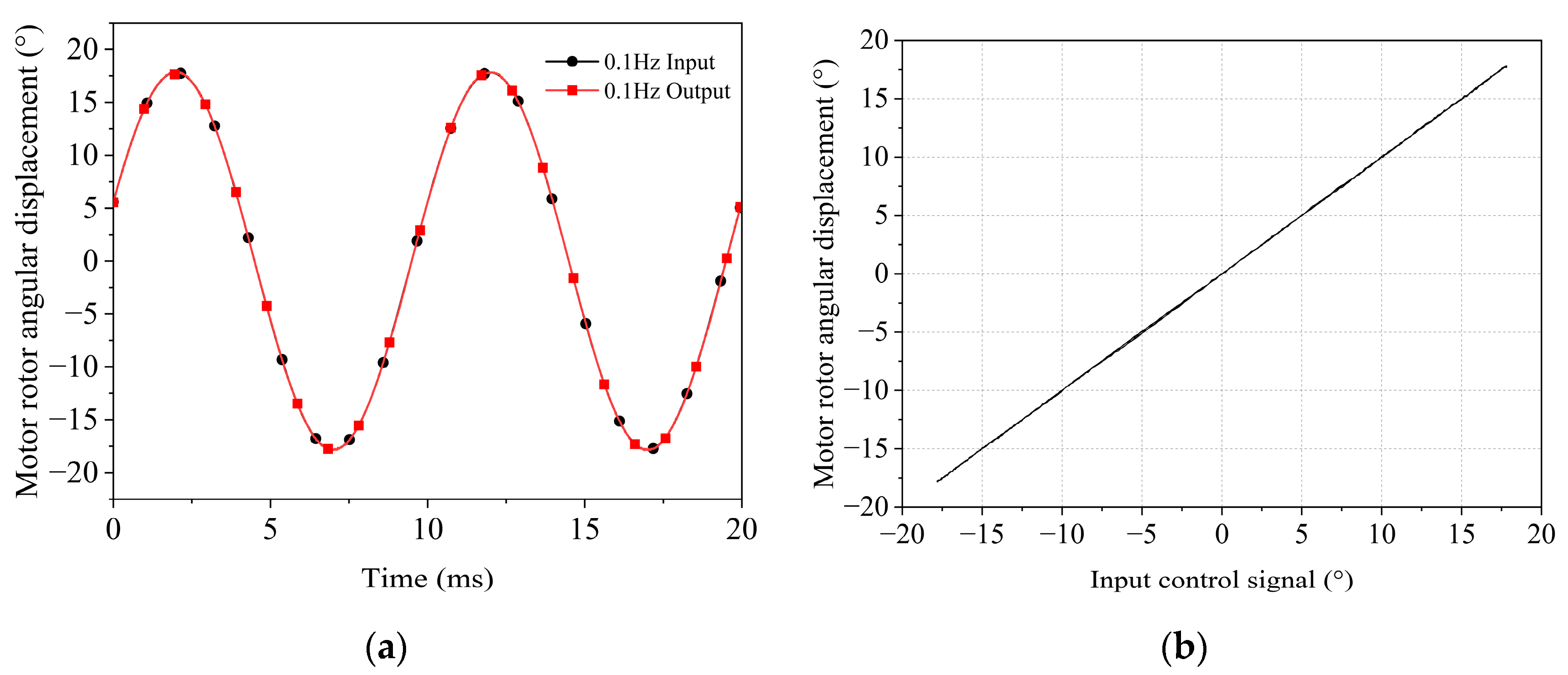 A sinusoidal signal with a frequency of 0.1 Hz and an amplitude of 17.75° was applied to the electro-mechanical converter to observe the tracking performance of its output displacement. As shown in Figure 12, a comparison of the input and output signals at 0.1 Hz indicated that the linearity of the input–output characteristics was 0.425% with negligible hysteresis.