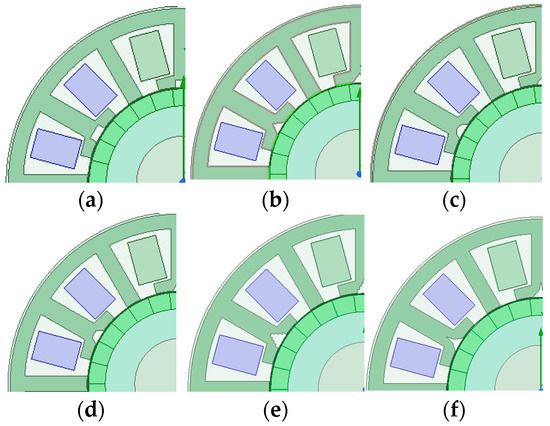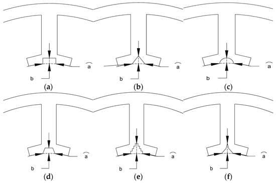 Different kinds of stator topologies: (a) conventional teeth; (b) triangular teeth; (c) circular teeth; (d) trapezoidal teeth; (e) staircase teeth; (f) tower-shaped teeth.