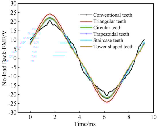 The no-load characteristics of PMVMs with six different FMP structures are studied separately, as shown in Figure 2 and Figure 3. Keeping the motor speed at 500 rpm, it is found that the no-load back EMF amplitude of PMVMs with five special tooth structures is greater than that of PMVMs with conventional tooth structures. The no-load back EMF amplitude of PMVMs with triangular teeth is the largest. At the same time, from the Fourier decomposition results of the no-load air gap magnetic density, the main harmonic orders contained in the six different PMVMs remain the same, but the amplitudes of the main harmonics are different. After conducting a comparison, it is found that the 5th harmonic, 13th harmonic, 23rd harmonic, 31st harmonic, and 39th harmonic of PMVMs with triangular teeth have significant advantages over conventional PMVMs. As shown in Figure 3, although the fundamental harmonic amplitude of PMVMs with tower-shaped teeth and PMVMs with trapezoidal teeth is higher than that of conventional PMVMs, their other low-order modulation harmonics do not have advantages. Therefore, the triangular tooth-shaped PMVM has best magnetic field modulation ability.