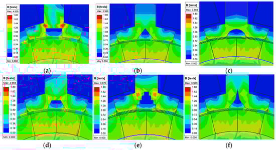 No-load magnetic flux density distribution of different PMVMs: (a) conventional teeth; (b) triangular teeth; (c) circular teeth; (d) trapezoidal teeth; (e) staircase teeth; (f) tower-shaped teeth.